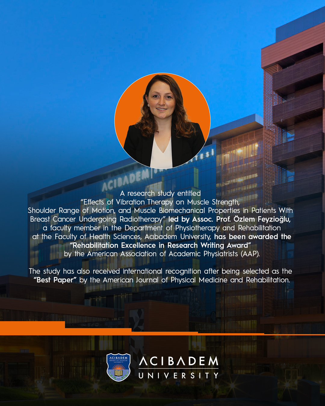 A research study entitled “Effects of Vibration Therapy on Muscle Strength, Shoulder Range of Motion, and Muscle Biomechanical Properties in Patients With Breast Cancer Undergoing Radiotherapy” led by Assoc. Prof. Özlem Feyzioğlu, a faculty member in the Department of Physiotherapy and Rehabilitation at the Faculty of Health Sciences, Acıbadem University, has been awarded the “Rehabilitation Excellence in Research Writing Award” by the American Association of Academic Physiatrists (AAP).