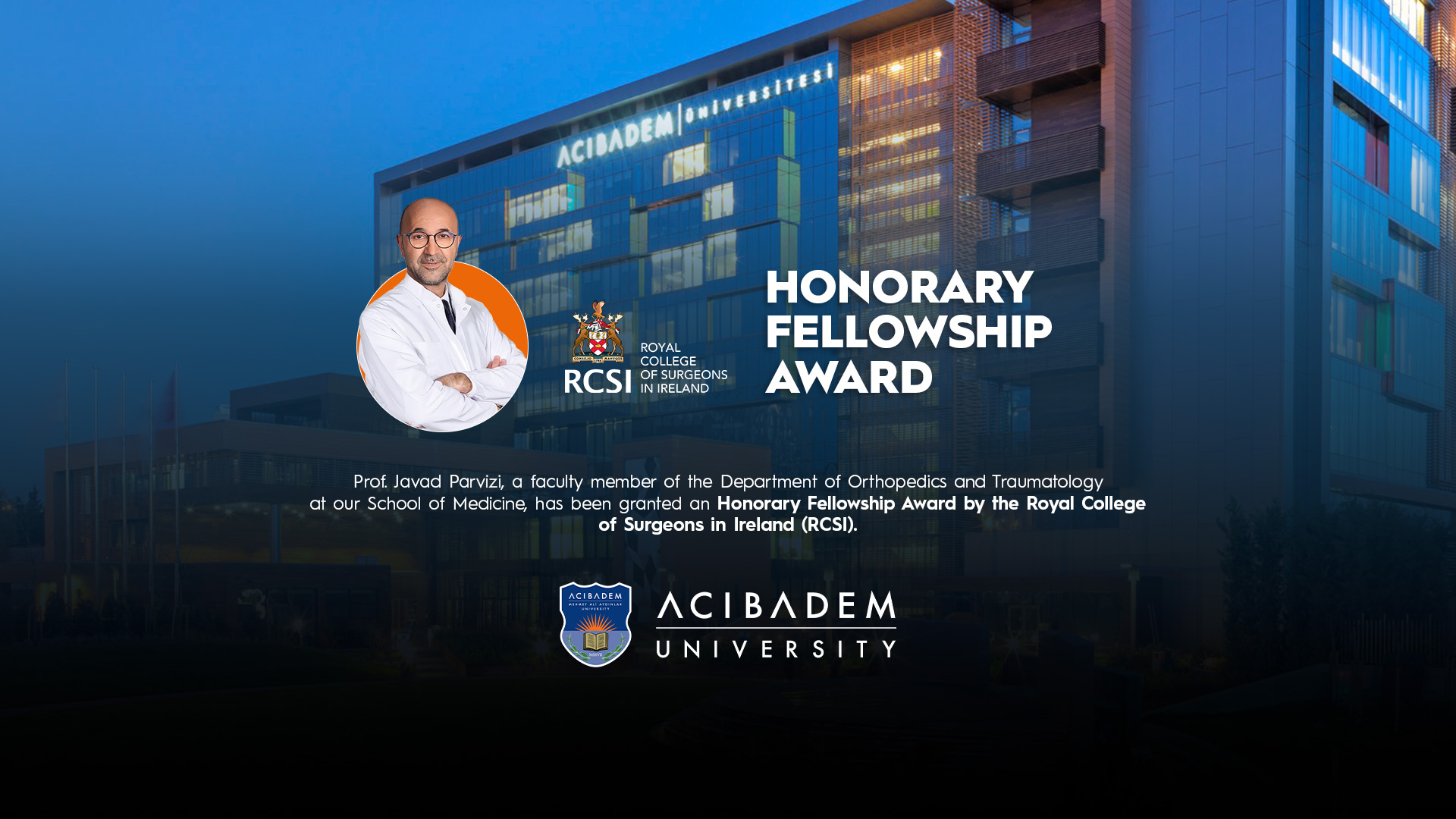 Prof. Javad Parvizi, a faculty member of the Department of Orthopedics and Traumatology at our School of Medicine, has been granted an Honorary Fellowship Award by the Royal College of Surgeons in Ireland (RCSI).