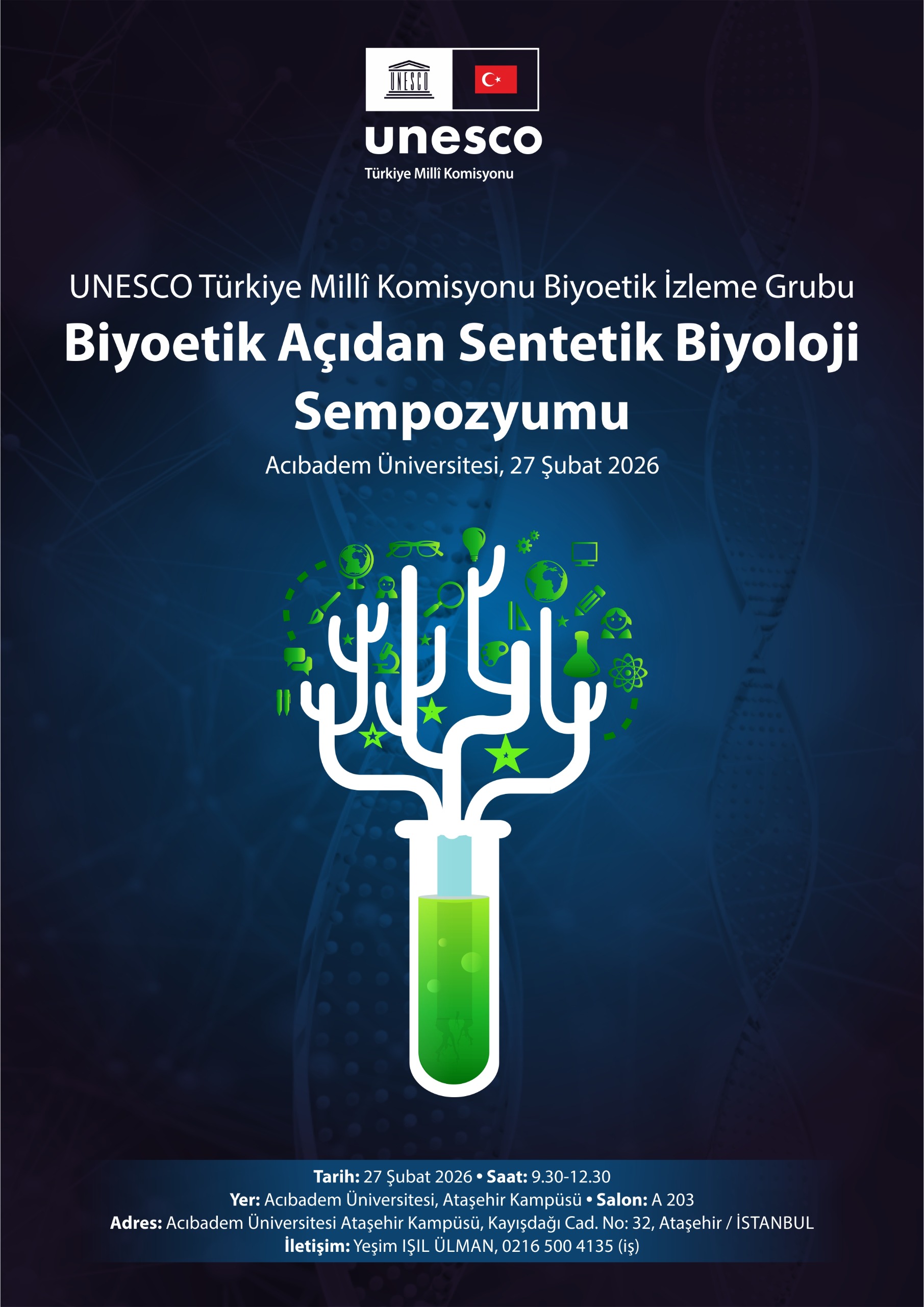 UNESCO Türkiye Ulusal Komisyonu Biyoetik İzleme Grubu ile Acıbadem Üniversitesi Tıp Fakültesi Tıp Tarihi ve Etik Anabilim Dalı iş birliğinde düzenlenen “Biyoetik Perspektifinden Sentetik Biyolojideki Yeni Gelişmeler Sempozyumu”, 27 Şubat 2026 tarihinde Acıbadem Üniversitesi Ataşehir Kampüsü’nde gerçekleştirilecek. Sempozyum tüm ilgililere açıktır.
