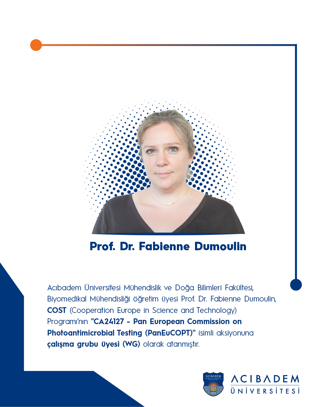 Acıbadem Üniversitesi Mühendislik ve Doğa Bilimleri Fakültesi, Biyomedikal Mühendisliği öğretim üyesi Prof. Dr. Fabienne Dumoulin, COST (Cooperation Europe in Science and Technology) Programı’nın “CA24127 - Pan European Commission on Photoantimicrobial Testing (PanEuCOPT)” isimli aksiyonuna çalışma grubu üyesi (WG) olarak atanmıştır.