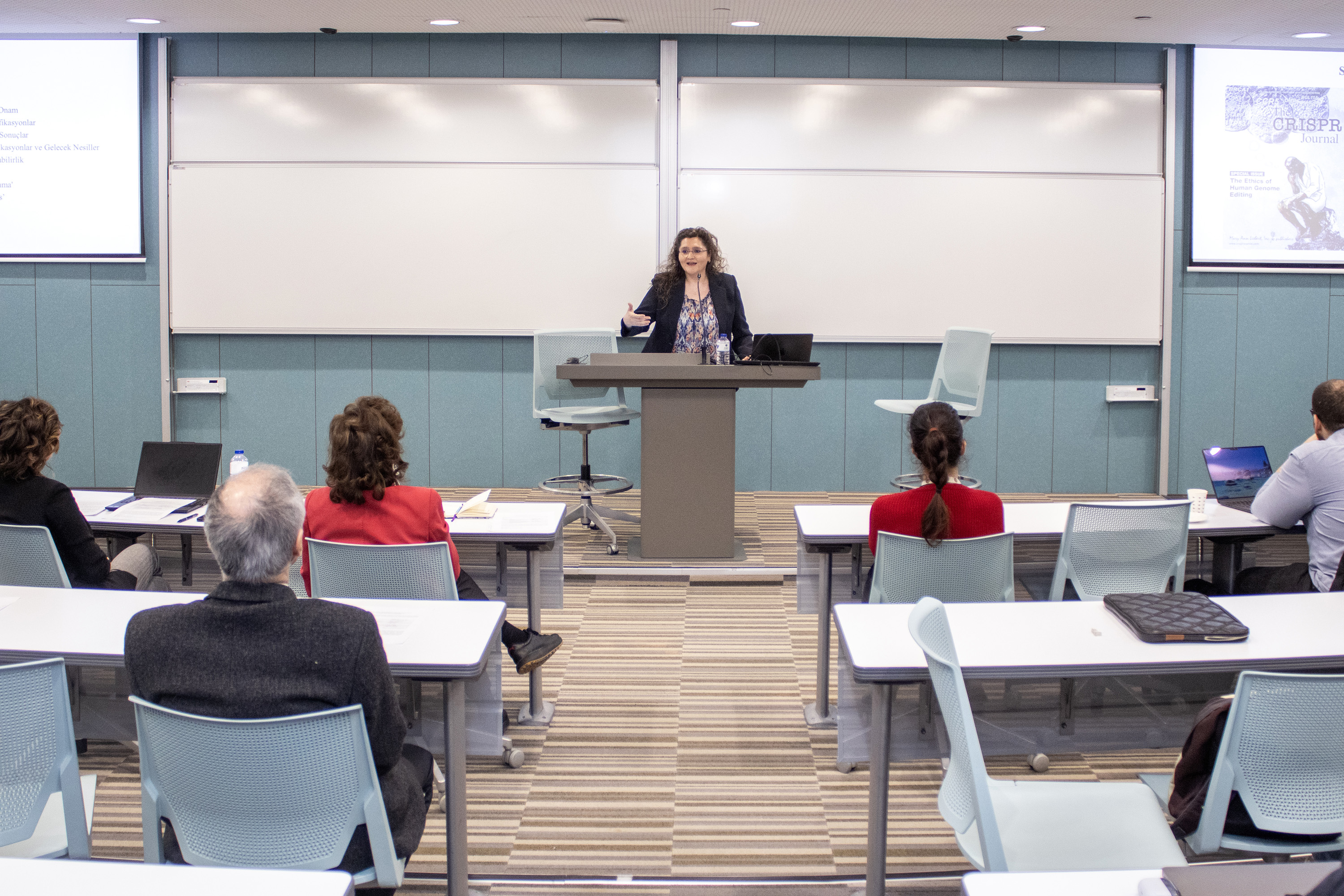 Özge Yücel Dericiler sentetik biyoloji alanındaki gelişmeleri insan hakları açısından değerlendirdi. Sentetik biyoloji, insan vücudunu yeniden yapılandırılabilir ve üzerinde mühendislik uygulanabilir bir çalışma sahasına dönüştürmektedir. Bu ise, bir yandan insan sağlığı, çevre, iklim gibi konularda baş döndürücü bir iyileşme potansiyeli sunarken, diğer yandan mevcut insan hakları hukuku ile çözülmesi güç yeni sorunlar ve riskler yaratmaktadır. Söz konusu riskler karşısında dayanıklılığı sağlayabilmek için, insan hakları risklerini öngören, önleyen, azaltan ve olumsuz sonuçları olabildiğince ortadan kaldıran bir mekanizmanın, sürecin başından itibaren dikkate alınması gerektiğini vurguladı.