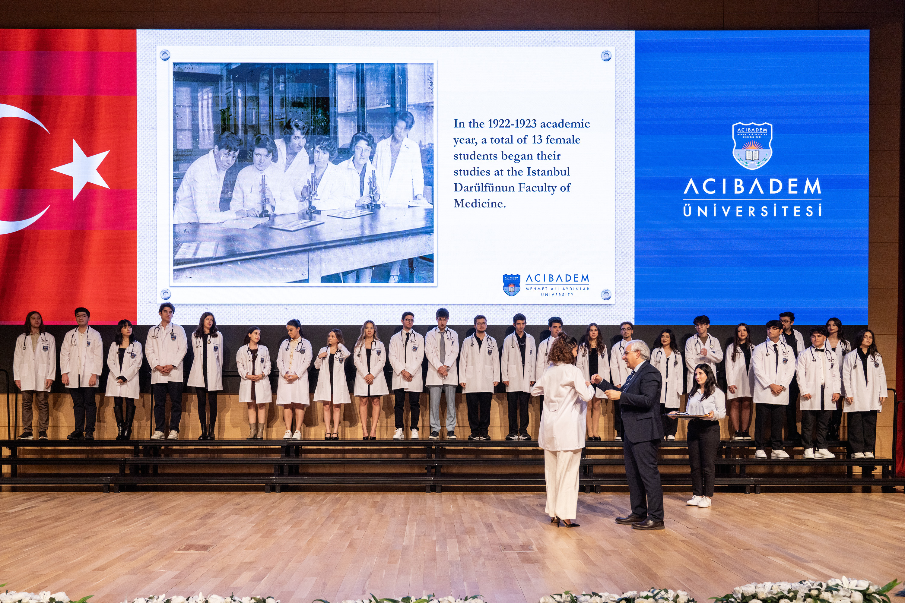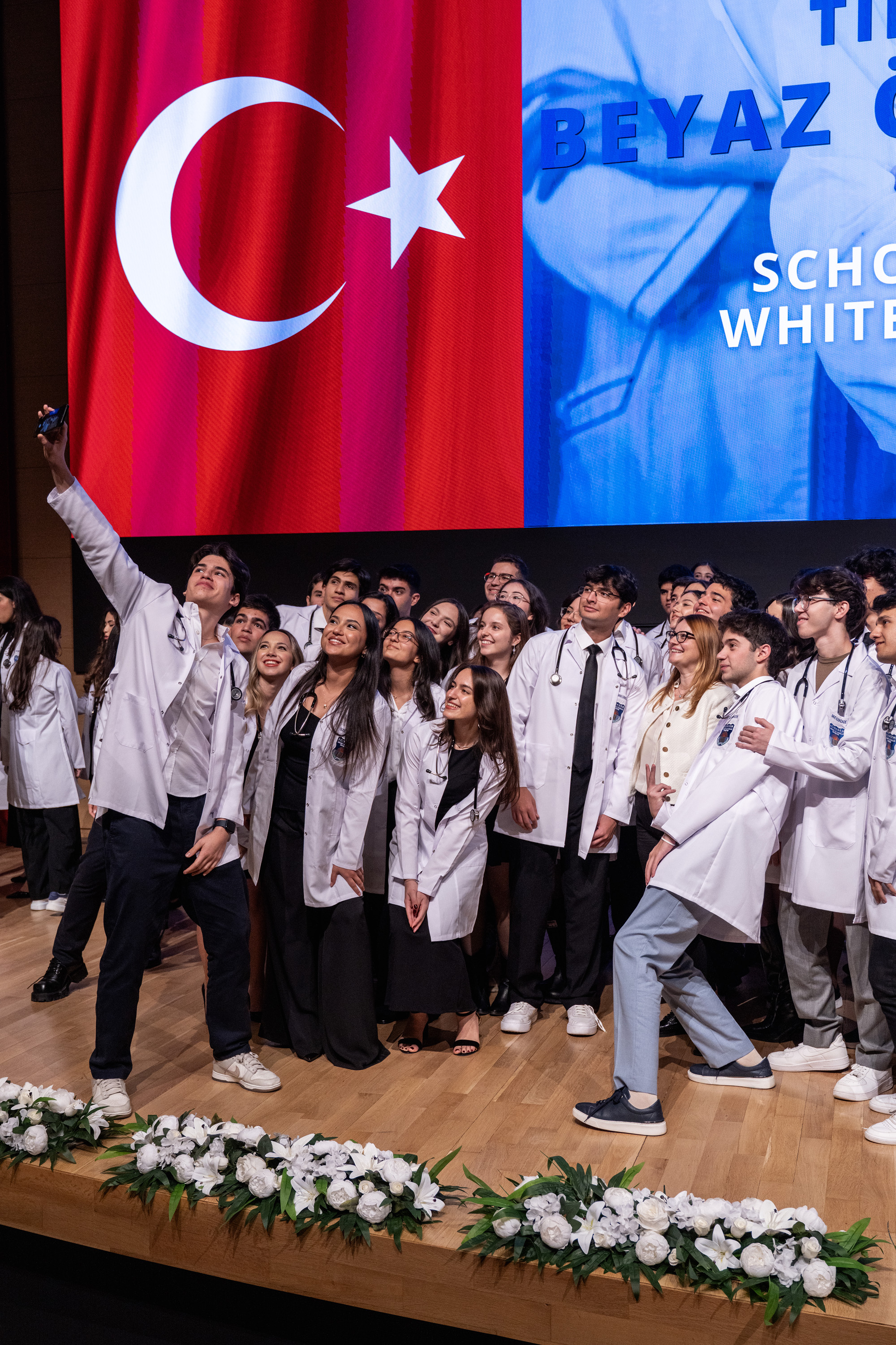 Tören, öğrencilerin beyaz önlükleriyle sahnede toplu fotoğraf çektirmesi ve alkışlar arasında sahneden ayrılmasıyla son buldu.
